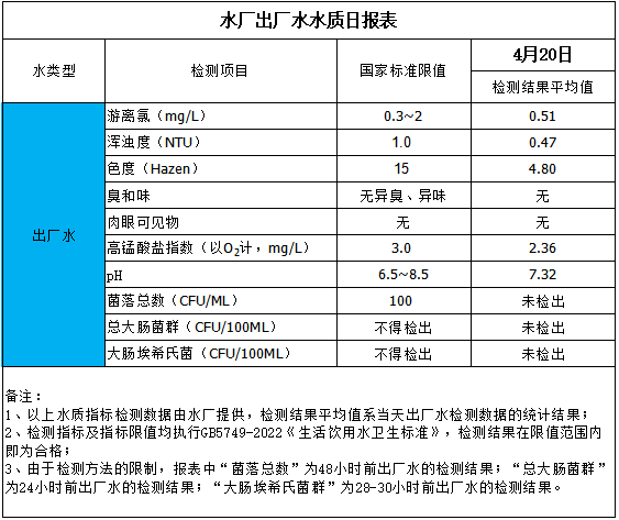 水廠出廠水水質(zhì)日?qǐng)?bào)表(2025-4-20)
