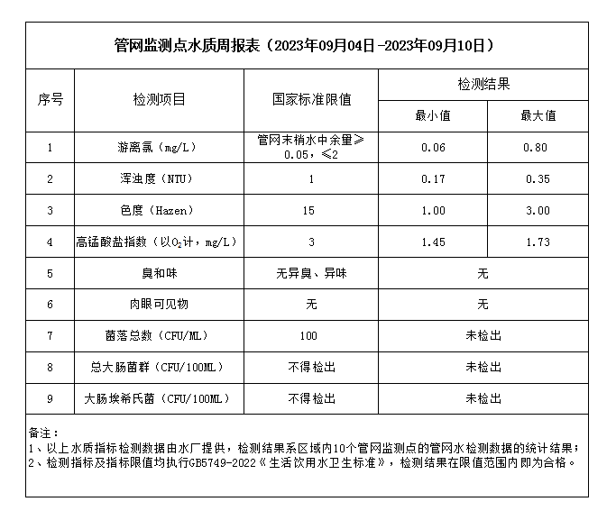 管網監測點水質周報表(2023年09月04日-2023年09月10日)
