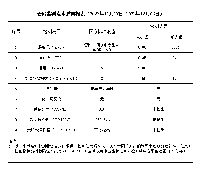 管網(wǎng)監(jiān)測點水質(zhì)周報表(2023年11月27日-2023年12月03日)
