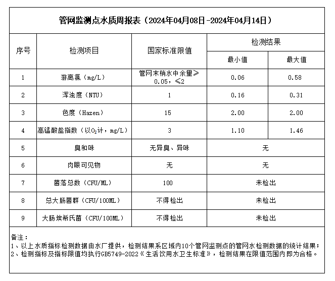 管網(wǎng)監(jiān)測點水質(zhì)周報表(2024年04月08日-2024年04月14日)