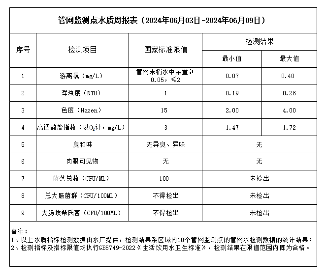 管網監測點水質周報表(2024年06月03日-2024年06月09日)