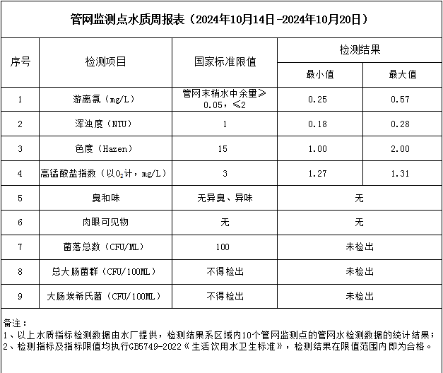 管網監測點水質周報表(2024年10月14日-2024年10月20日)