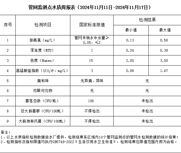 管網監測點水質周報表(2024年11月11日-2024年11月17日)
