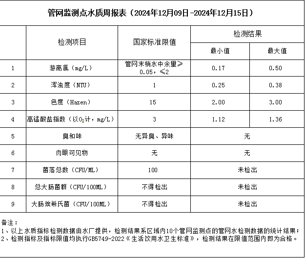 管網監測點水質周報表(2024年12月9日-2024年12月15日)