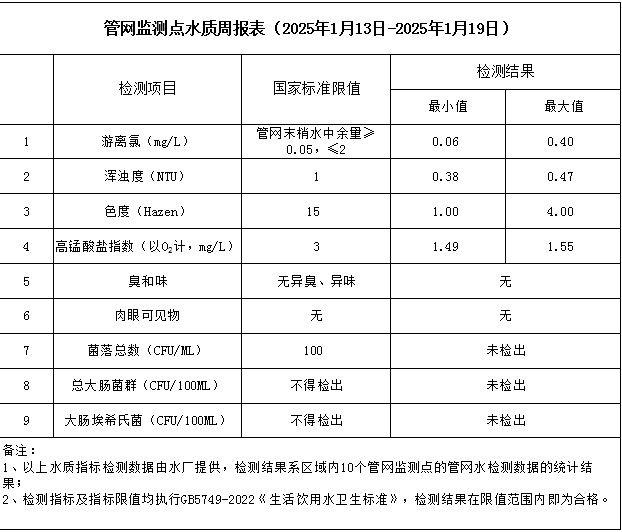 管網監測點水質周報表(2025年1月13日-2025年1月19日)
